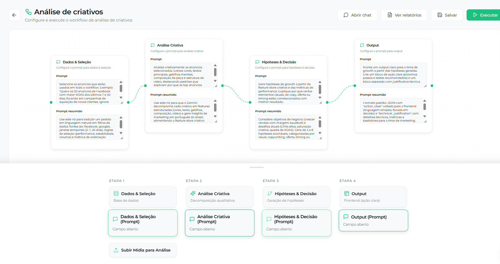 Os agentes operam diretamente sobre os seus dados reais de mídia, vendas e criativos para identificar gargalos, padrões e oportunidades que passam despercebidos.