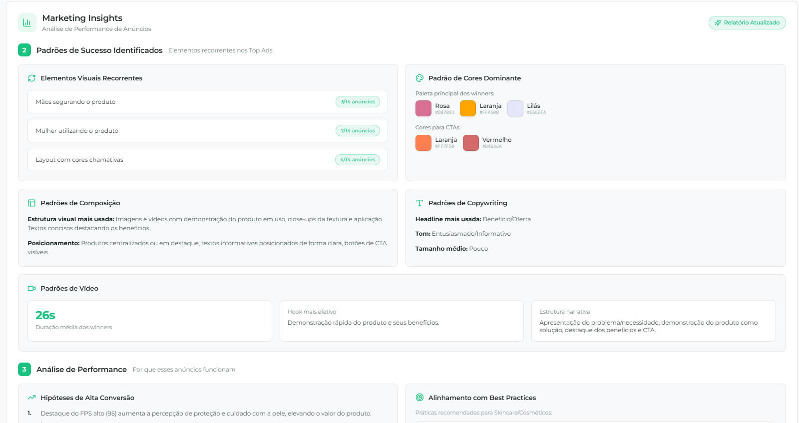 A Solomon usa IA para segmentar e analisar criativos por formato, ângulo, hook, mensagem e padrão visual. Em vez de apenas dizer "esse anúncio performou melhor", os agentes identificam o por quê.